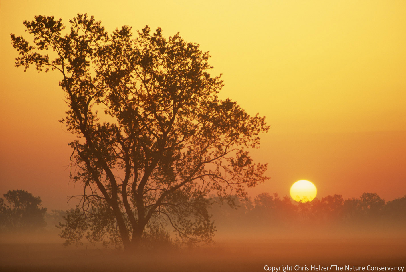 WOPA051021_D008 Published November 9, 2016 at 1423 × 954 in Photos, not Politics (INTERNAL RIGHTS ONLY, CREDIT IS MANDATORY) Sunrise over meadow along Central Platte River, Nebraska. Hall County, Nebraska. May 1995. TNC Caveny Tract. Cottonwood tree. Lowland tallgrass prairie. Central Mixed-Grass Ecoregion. © Chris Helzer