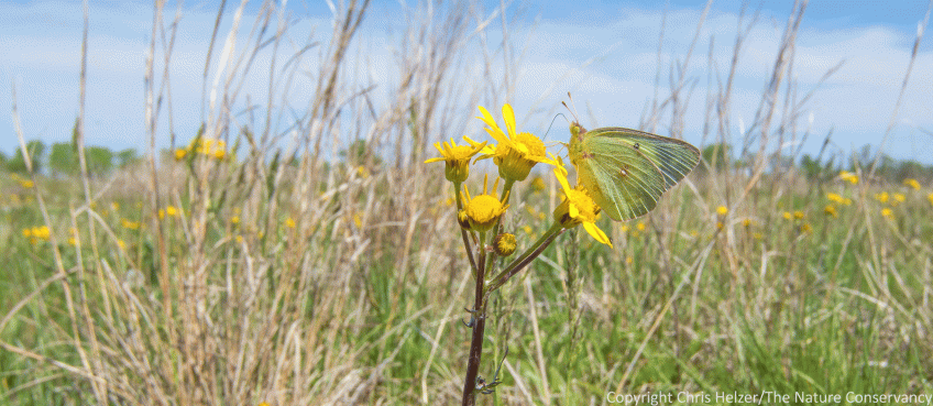 ENPO170508_D001 Published May 19, 2017 at 1800 × 783 in Photo of the Week – May 19, 2017 Prairie ragwort (Packera plattensis) was a welcome sight for this orange sulphur butterfly after its northward migration this spring.