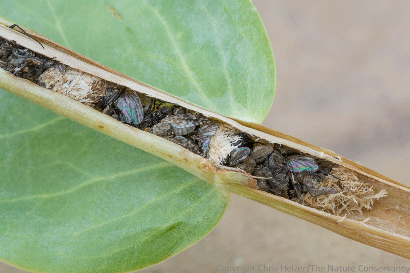 ENPO170525_D015 Published May 26, 2017 at 1416 × 944 in Photo of the Week – May 26, 2017 Here is a close-up photo showing the diversity and abundance of the flies jammed into the stem. I looked, but didn’t see the eggs that must have been there.