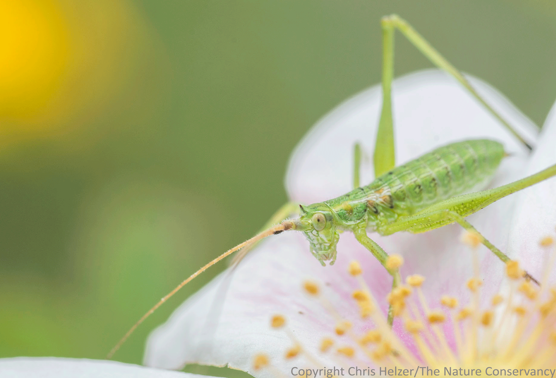 ENPO170613_D012 Published June 15, 2017 at 1854 × 1263 in Photo of the Week – June 15, 2017 A young katydid nymph feeds on wild rose pollen.