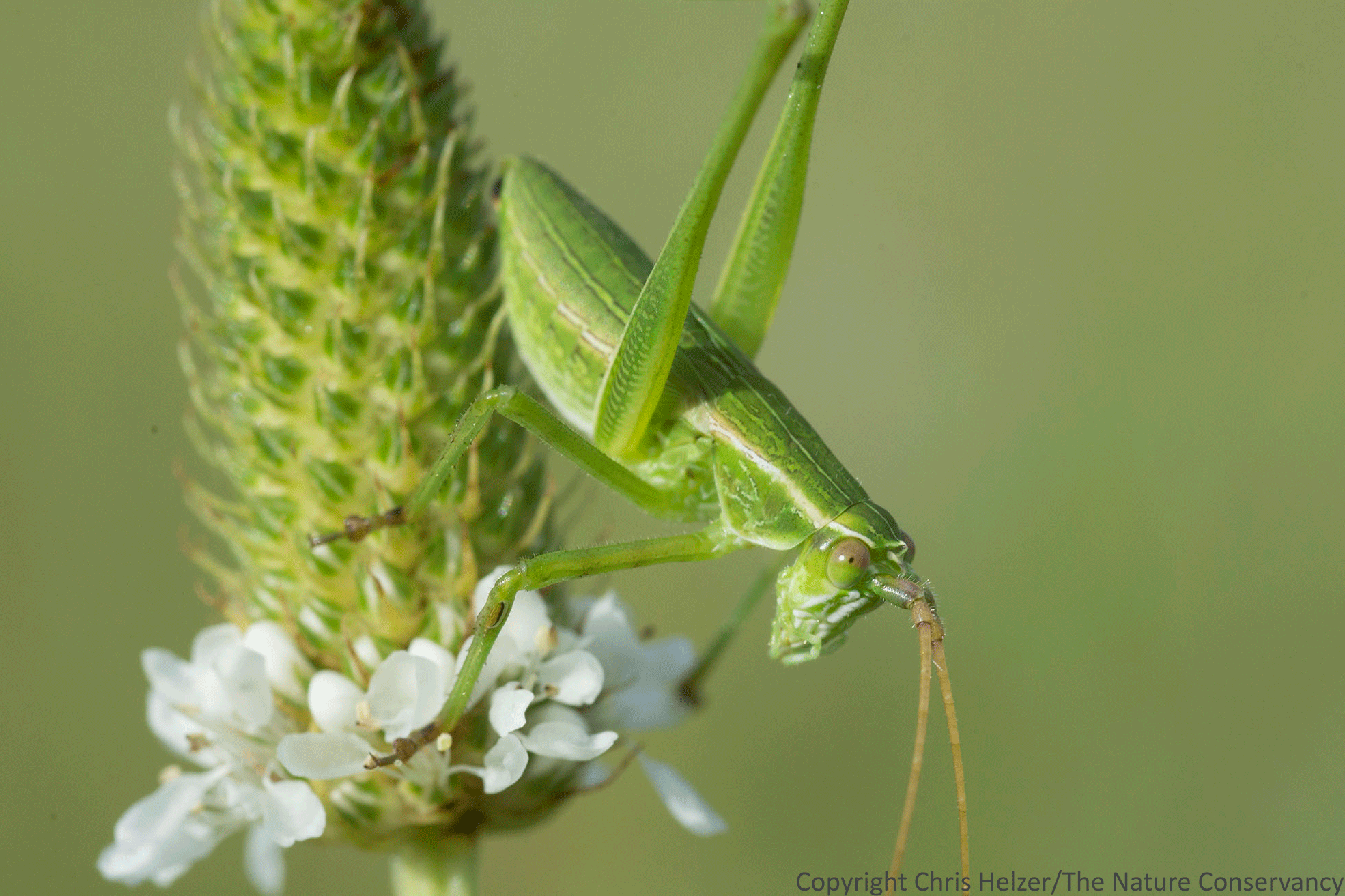 ENPO170703_D007 Published July 3, 2017 at 1970 × 1313 in Photo of the Week – July 6, 2017 Katydid nymph on white prairie clover (Dalea candida).