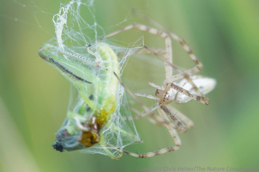 ENPO170710_D010 Published July 10, 2017 at 1458 × 972 in Spider Watching I managed to get this shot during a very brief moment when the spider paused while wrapping the grasshopper nymph. The image is a little fuzzy because I was shooting through some vegetation, trying not to disturb it.