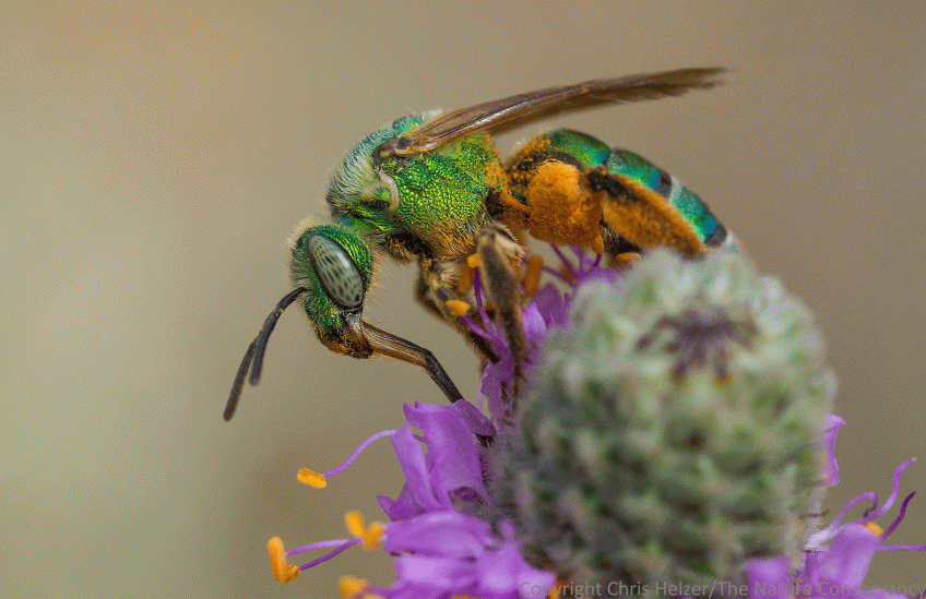 A metallic green sweat bee (Agapostemon splendens) feeds on purple prairie clover, displaying its long tongue. (thanks to Mike Arduser for identifying this)