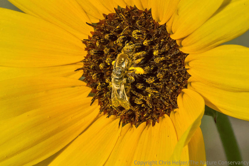 ENPO170729_D032 Published August 1, 2017 at 1338 × 892 in Popular Sunflowers As a small female bee (Perdita albipennis) was gathering pollen from this sunflower, a male zipped in and began mating with her. She dragged him around and just kept foraging…