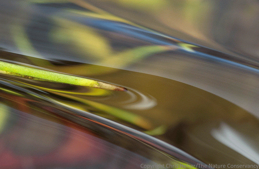 ENPO171004_D006 Published October 5, 2017 at 1934 × 1262 in Photo of the Week – October 5, 2017 Water flows over a small beaver dam, split and rippled by multi-colored vegetation.