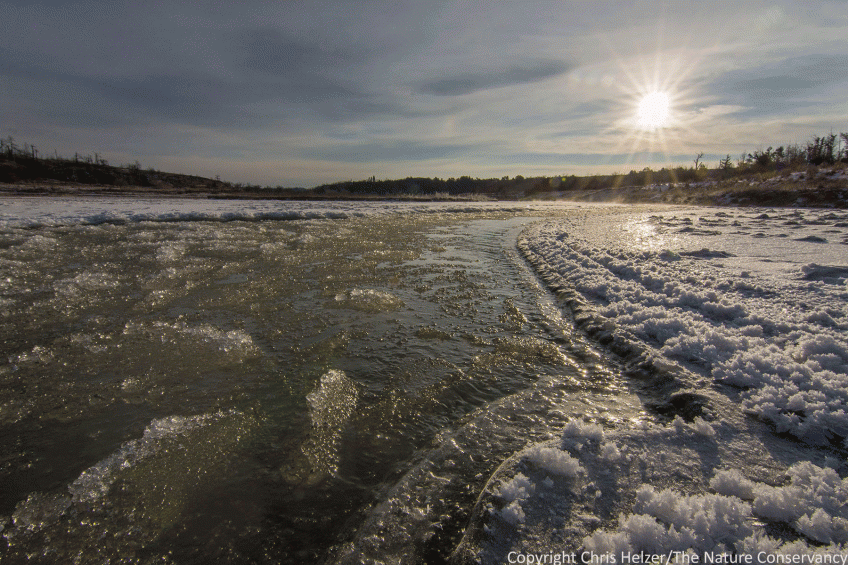 ENPO171227_D010 Published December 28, 2017 at 1800 × 1200 in Photo of the Week – December 28, 2017 Slushy ice floats down the Niobrara River as the sun comes up.