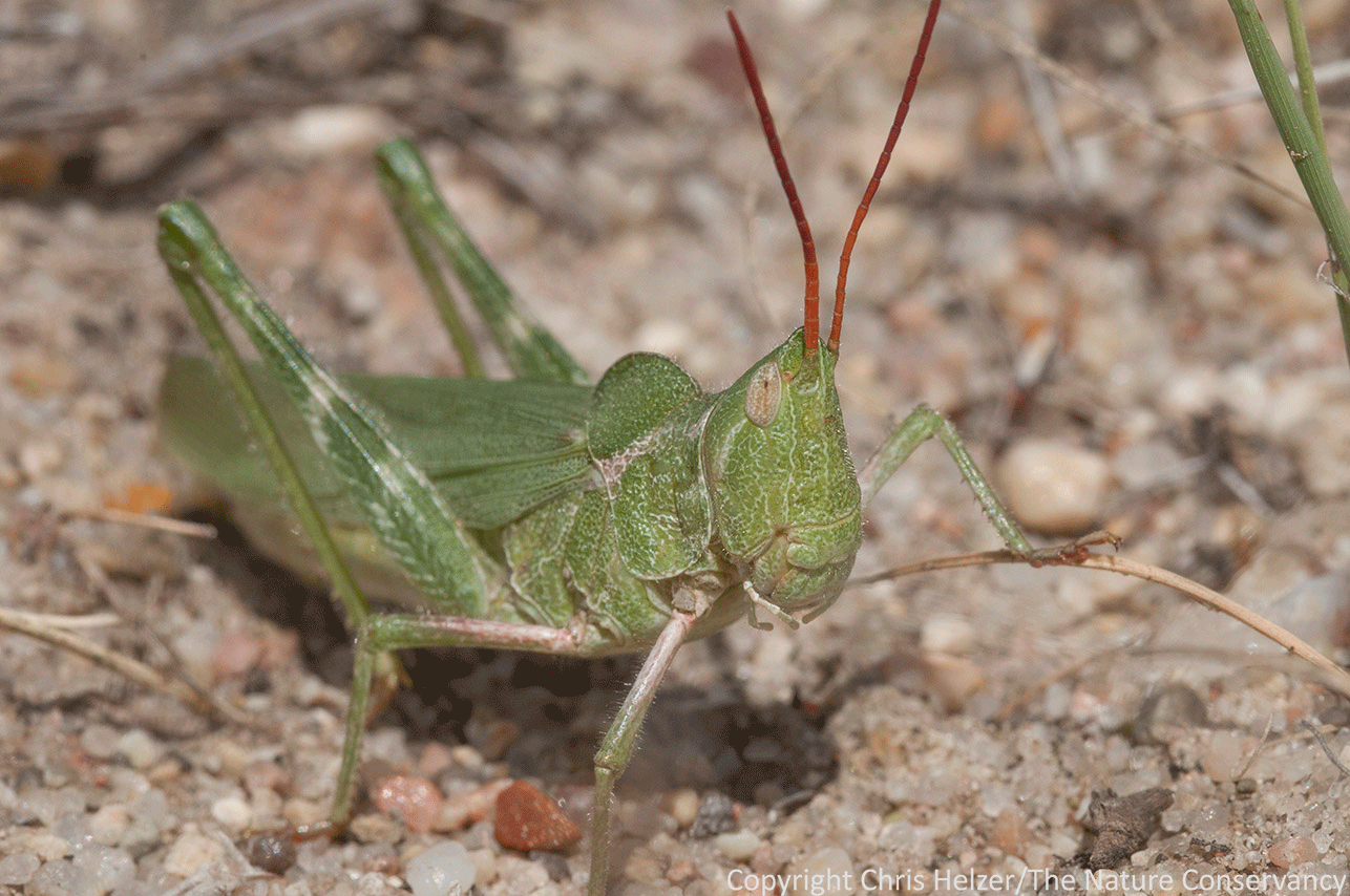 ENPO160822_D044 Published January 9, 2018 at 1286 × 854 in The Diversity, Beauty, and Secret Lives of Grasshoppers How can you not like and admire the green fool grasshopper (Acrolophitus hertipes), with its raised back ridge, bright red antennae and charming face?
