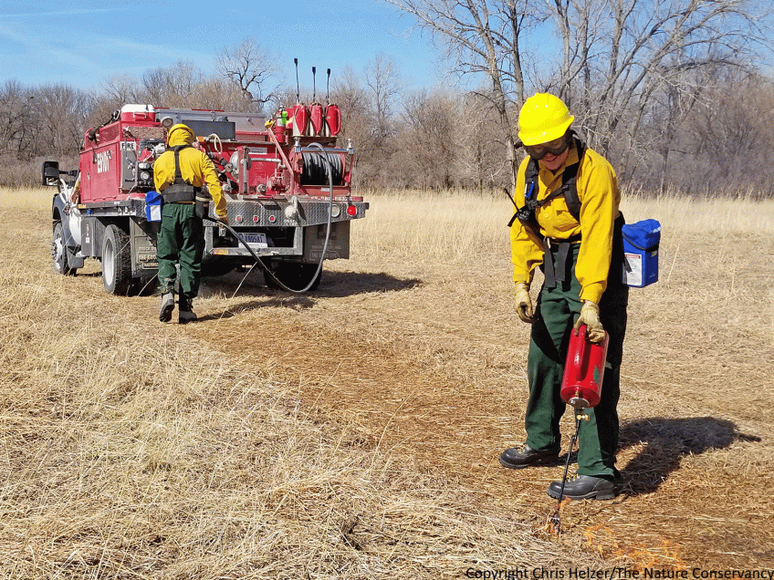 ENPO180308_D002 Published March 10, 2018 at 1613 × 1210 in Properly Portraying the Power of Prescribed Fire In this photo, we’re laying down a band of water along the edge of a mowed strip surrounding our burn unit, and Olivia is lighting the grass just upwind of that wet and mowed line.