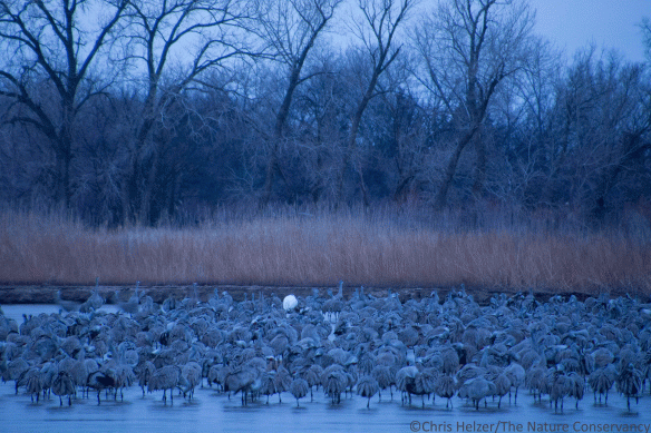 It’s kind of a sad situation, but does give visitors to this part of the state an improved chance of seeing a whooping crane.  Most whoopers migrate through this area later in the spring, after the sandhill cranes (and the crowds that come to watch them) have left.  A fairly small percentage of whooping cranes stop at the Platte each spring, and those that do stop are usually just here for a night or two, making it unlikely that many people will see them.  By contrast, the “lonely” whooper often stays for a few weeks or more, making it pretty accessible to grateful crane watchers.