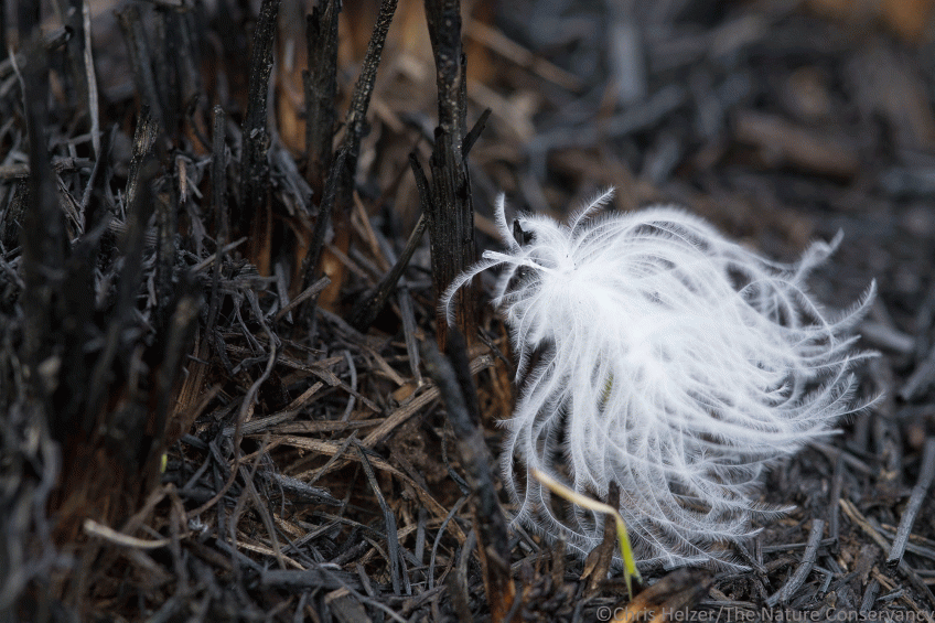 The prairies we burned a couple weeks ago have been popular feeding spots for the hordes of sandhill cranes that are looking for underground invertebrates to feed on. Did I photograph those cranes on our burned prairies? No, I found and photographed a dainty little down feather from one of them instead.