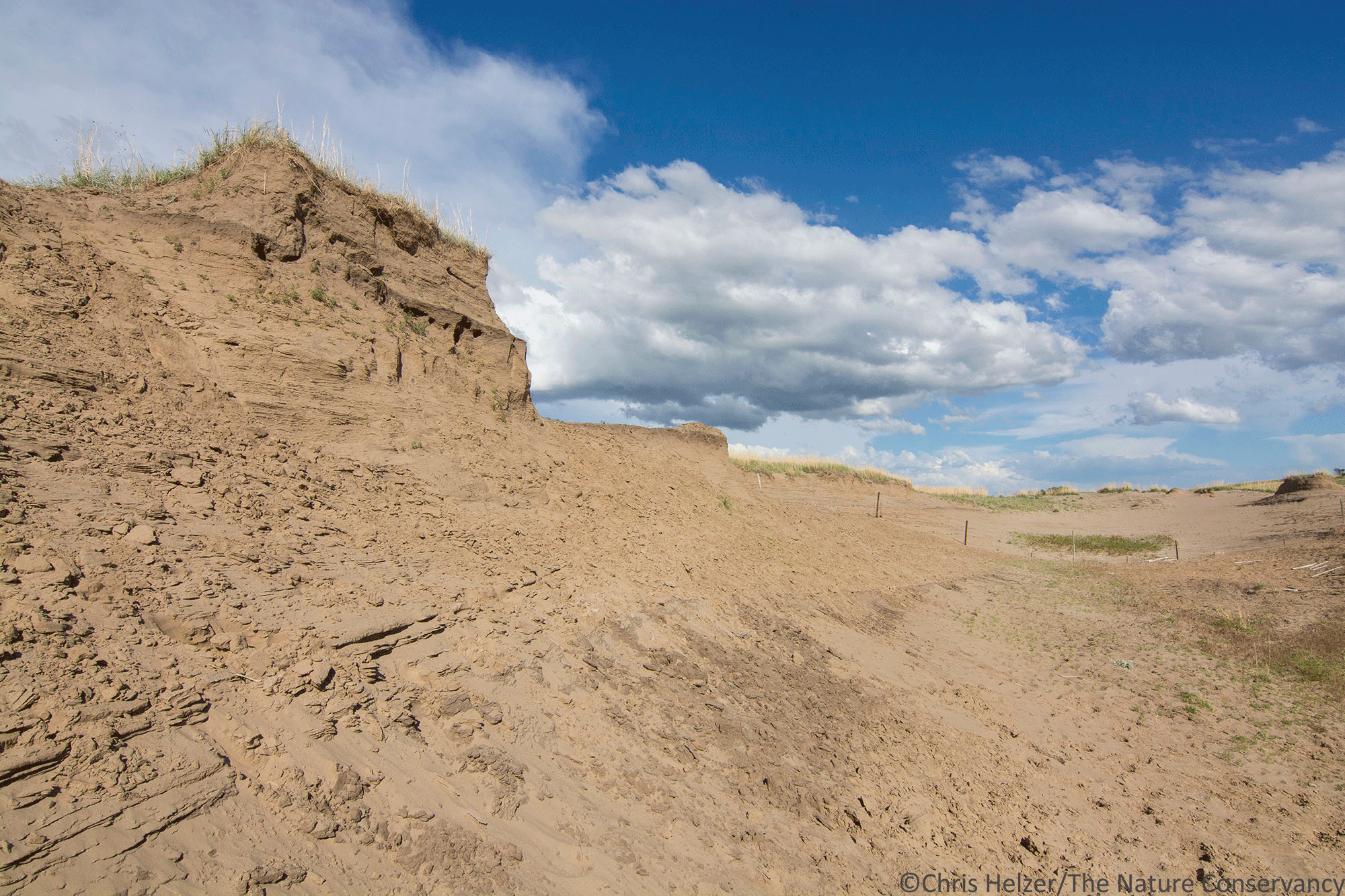 This is a giant blowout at the Niobrara Valley Preserve, but it’s unlike most blowouts in that it has steep bluffs on the north and south sides that have texture almost like sandstone. We found a burrowing owl nest on the south bank a couple years ago.