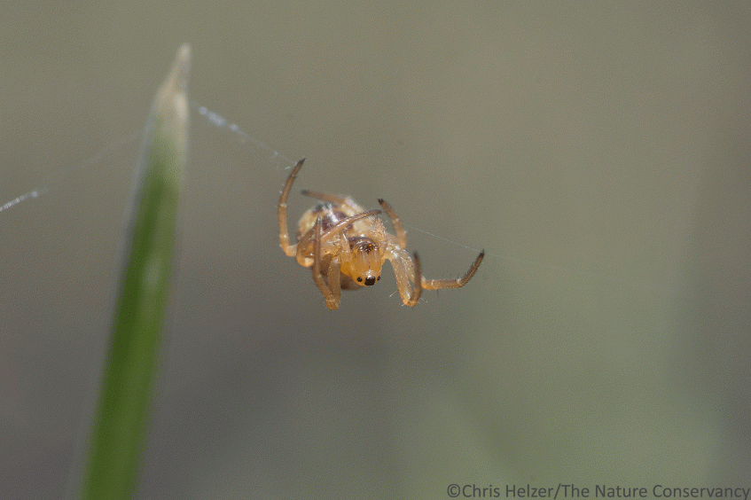 This tiny orb weaver spider was starting a web in a recently burned patch of prairie. The grass was only a few inches tall, but the spider was using the breeze to string silk between the young shoots. I laid on my belly for quite a while and watched it work.