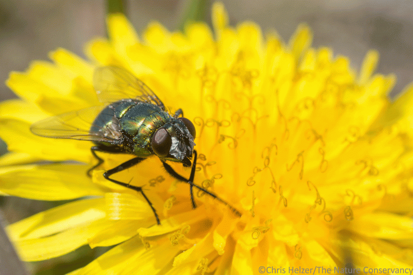 Dandelions (Taraxacum officianale) are playing their annual role of supporting early pollinators until native wildflowers really get rolling. Yesterday was the first time I’d seen any blooming, but I saw several flies (including this one) and a honey bee feeding from them.