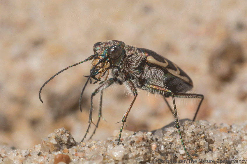 ENPO180424_D012 Published April 25, 2018 at 1915 × 1277 in Re-emerging into the Warm Sunshine I’m pretty sure this is the bronze tiger beetle (Cicindela rapanda) because it fits both the visual description and the habitat (bare moist sand near the river). This was the most common tiger beetle I saw.