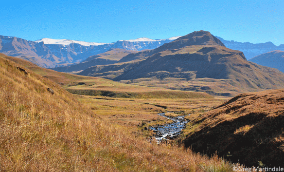 Grassland and mountains in the Lotheni Nature Reserve, which is part of the uKhahlamba Drakensberg World Heritage Site. The vegetation types here are montane grasslands, Southern Drakensberg Highland Grassland and uKhahlamba Basalt Grassland. These grasslands are grazed by free roaming wildlife species, the largest of which are eland and they are burnt on three or four year cycles. Photo and caption information by Greg Martindale