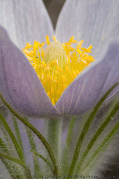 As Kim and I walked around those hills last summer, I promised myself I’d figure out a way to photograph the pasque flowers in bloom during the spring of 2018.  As spring finally staggered out of the gate this year, I kept a watchful eye on Facebook and Instagram posts and checked in periodically with friends – all in an effort to gauge the best time to head north for pasque flower photography.  A couple weeks ago, our Hubbard Fellows made a trip up to the Preserve, and I had them scout the site for me.  Olivia sent me a photograph of a blooming pasque flower, but said the majority of plants hadn’t flowered yet.  Shortly after that, the area got over a foot of snow, which I figured would slow things down a little.  For the next two weeks, I nervously watched the calendar, focusing on this week’s scheduled staff meeting at the Preserve, and hoping the timing would work out for pasque flowers too.  I was sorely afraid I’d arrive only to find that I’d missed the peak bloom by just a few days.