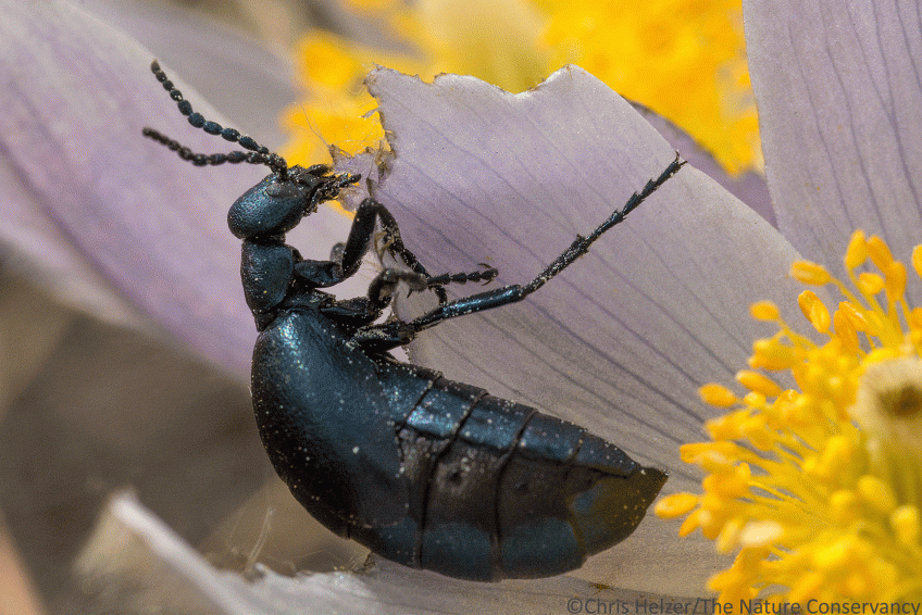 ENPO180430_D020 Published May 6, 2018 at 1727 × 1152 in Toxic Bee-Killing Hitchhiker Beetles (I Know, Right?) An oil beetle feeding on pasque flower at the Niobrara Valley Preserve last week.