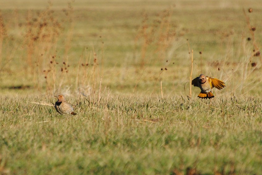 Though overall drab in appearance, northern flickers flash bright yellow or red when in flight. This yellow-shafted male followed around the female at the left of the photo for several minutes. Notice the female is missing the mustache of the males. Photo by Olivia Schouten
