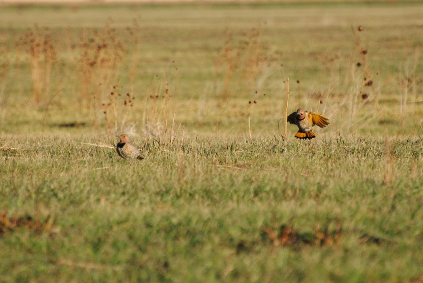 Though overall drab in appearance, northern flickers flash bright yellow or red when in flight. This yellow-shafted male followed around the female at the left of the photo for several minutes. Notice the female is missing the mustache of the males. Photo by Olivia Schouten