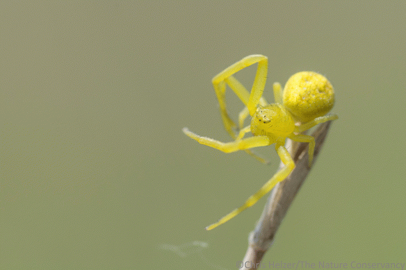 As it happens, I’ve already found and photographed a few crab spiders this week.  One, in particular, was a lot of fun to watch.  I spent most of Monday collecting plant data (in a walking boot, which is frustratingly slow, but a great deal better than crutches).  Though it was windy, there were periods of nice light, thanks to some passing diffuse clouds.  During one of those periods, I spotted a yellow crab spider crawling up a dead grass stem.  I paused to see what it was going to do, reaching slowly for my camera.  When it got to the top of the stem, it released a long burst of silk into the wind, and soon thereafter starting crawling along that silken thread to another grass stem a few feet away.