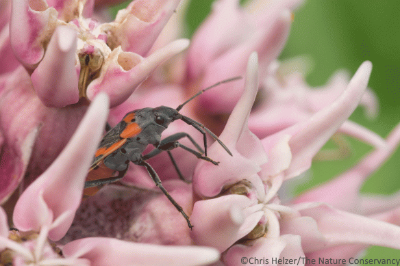 A small milkweed bug (Lygaeus kalmii) explores a showy milkweed plant (Asclepias speciosa). They feed on nectar and milkweed seeds, but can also act as scavengers and predators when food is scarce.