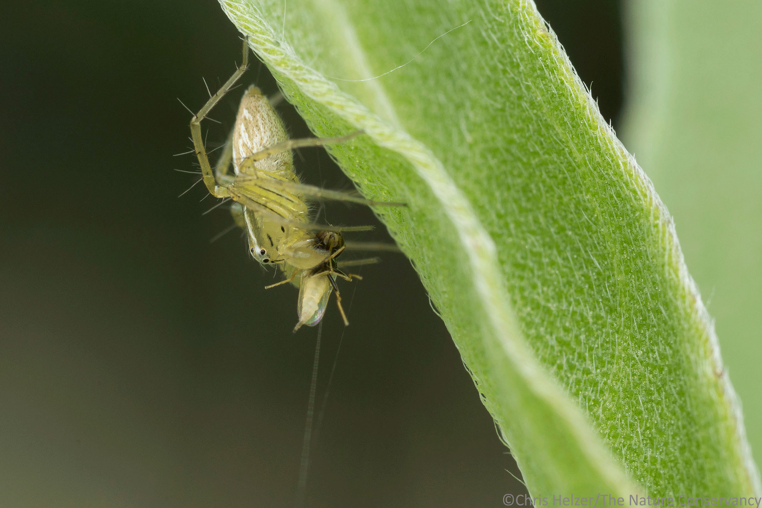 ENPO180624_D027 Published July 3, 2018 at 2421 × 1614 in Square Meter of Prairie Project – June 2018 Just a few minutes after I photographed the lynx spider, I spotted it again (or another just like it), this time with one of those tiny flies in tow.