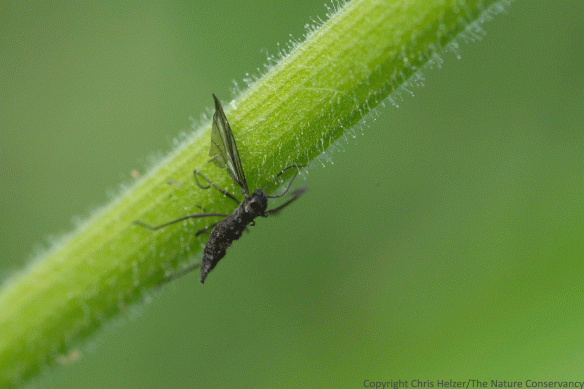 This little gnat (midge? something else? I can’t see the antennae) was the smallest insect victim I found. If you click on this photo you can zoom in and see the droplets on the tips of the hairs.