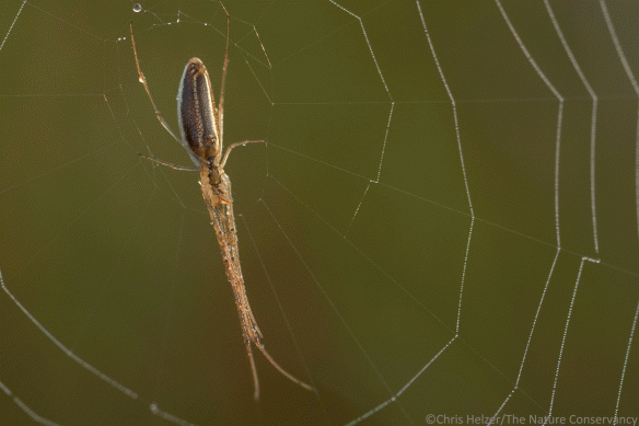 Most webs are close to the ground, surrounded by tall vegetation, making them nearly impossible to approach without jiggling the web, and either breaking it or scaring the spider away – or both. To add to the difficulty, most spiders sit on the downward slanting side of their web, with their eyes facing down and away from the sun. I always like to feature the faces of invertebrates when I can, but it’s not always possible to find a camera angle that works with web-weaving spiders.