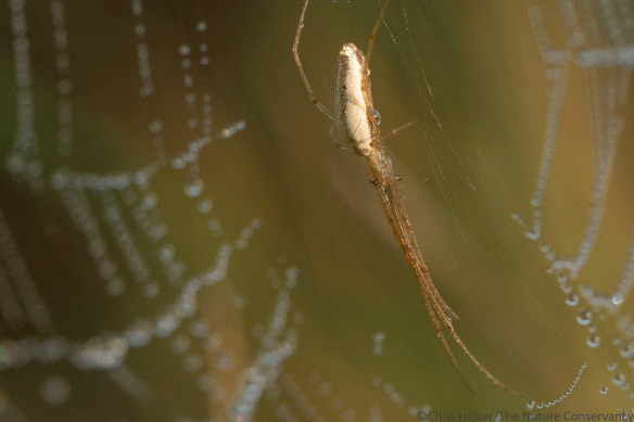 The chance to photograph spiders on dew-covered webs always feels like a gift. The conditions have to be just right – including near-zero wind velocity. Late summer seems to be the time when an abundance of spider webs corresponds with an abundance of calm foggy/dewy mornings. On those mornings, I tread carefully through prairies, trying hard not to blunder through webs, but knowing I will anyway. I find most webs by looking toward the sunlight so that the glowing backlit dew-covered orbs stand out against a darker background.