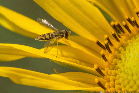 • Thanks for the kind words, Don. Flies definitely feed on pollen. The one in the Indiangrass photo is doing just that, and we see them commonly on lots of grasses (which don’t make nectar), including corn. Bees are more efficient/effective pollinators than most flies in several ways, though. First, not all flies are fuzzy enough for pollen to stick to them, so while they eat the pollen, they don’t really pollinate flowers much at all. Other flies, though, are very fuzzy and carry pollen very well. Bees tend to be much better about moving from one to another of the same flower species than other insects, though, and that might be the biggest factor that sets them above other insects in terms of pollination effectiveness.
