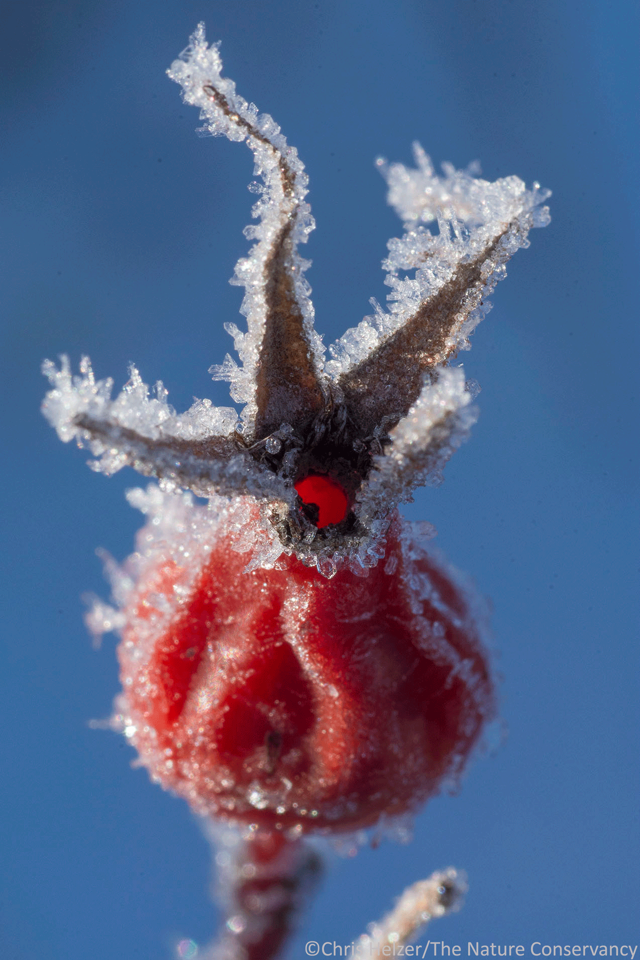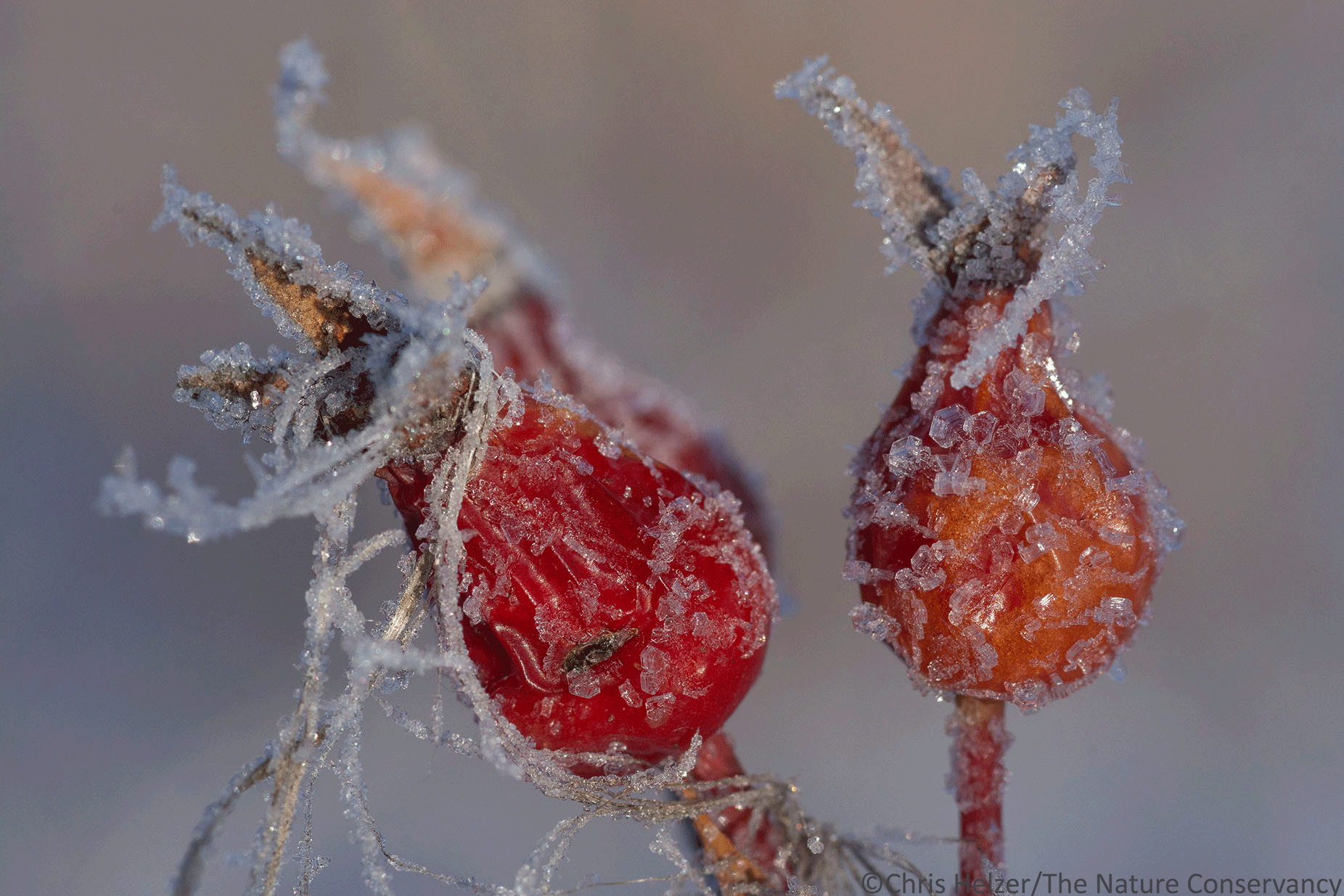 For this week’s Photo of the Week series, I dug back into the photos from last month’s trip to the Niobrara Valley Preserve. On the last day of the trip, we woke up to fog and frost layered on top of an already snow landscape. The combination created a landscape of nearly monotone white. While I found plenty of photo opportunities across the frosty landscape, any bit of color really stood out against that background. Maybe the strongest examples of that were the numerous wild rose hips scattered around. Here are some photos I took of those rose hips, along with one landscape photo to help set the scene for you. Enjoy!