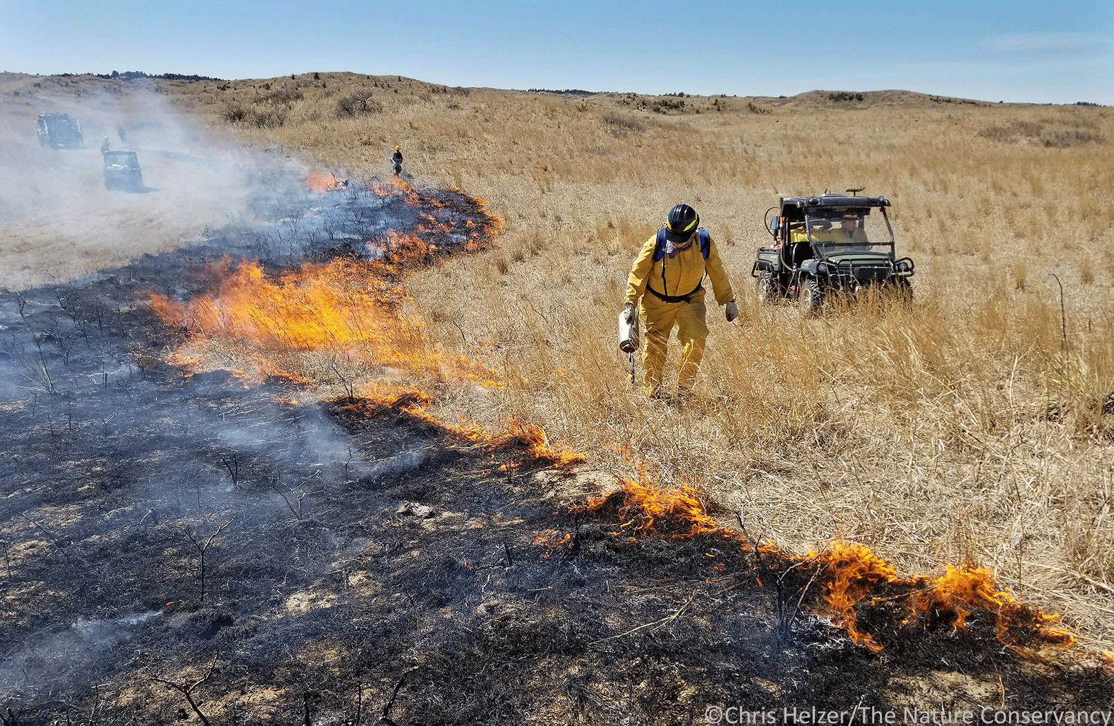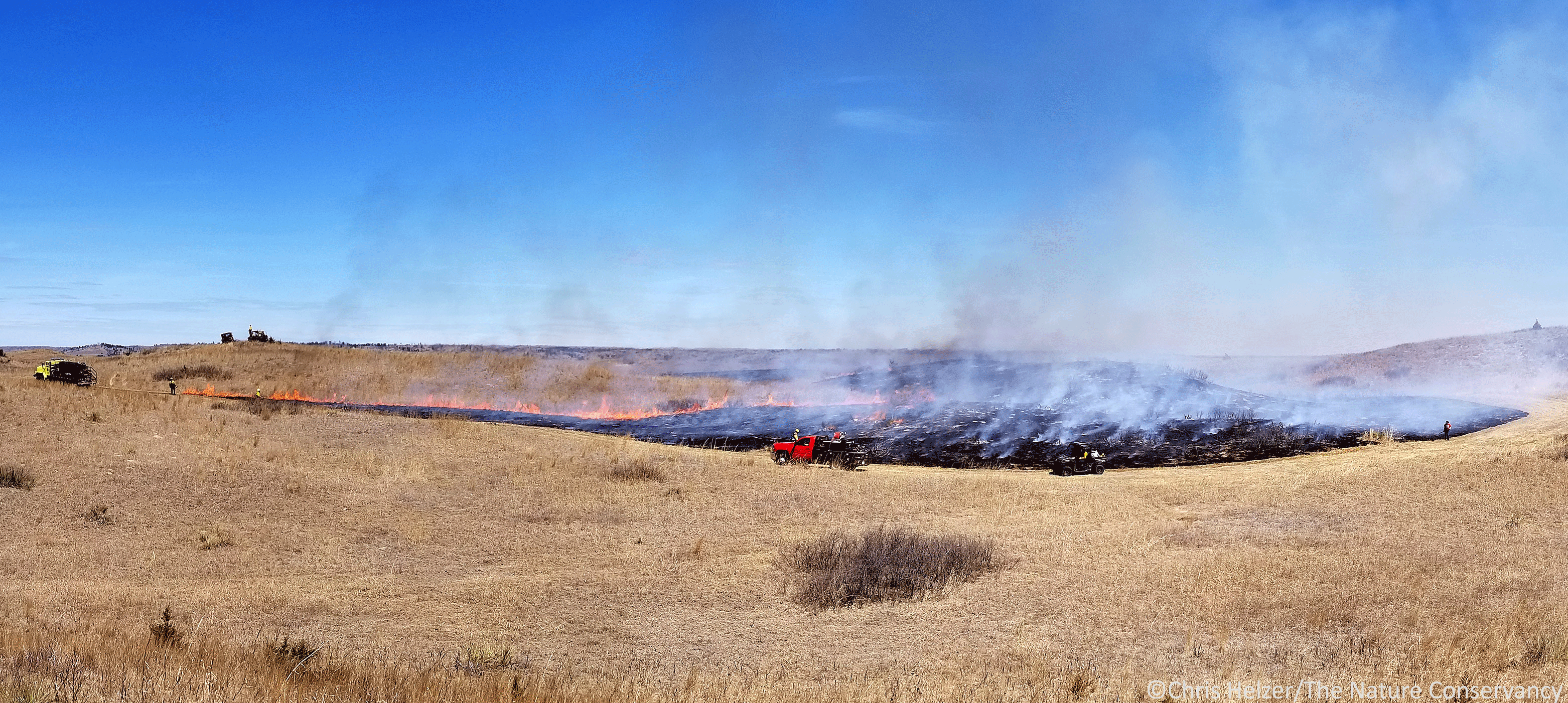 The first burn took place on a bright sunny day when relative humidity was near the low end of our weather prescription (the range of weather conditions we felt were acceptable for both safety and to meet objectives). We were trying to burn about 1,000 acres of Sandhills prairie that spanned the border between The Nature Conservancy and our neighbor to the south. Chad Bladow, our burn boss, had some difficult decisions to make. We had a large crew – numbering about 30 people or more – that included staff from several organizations and nearby ranches. However, by the time we were ready to start the burn, the relative humidity had already dropped to about 30%, considerably lower than the forecast said it would be by late morning.