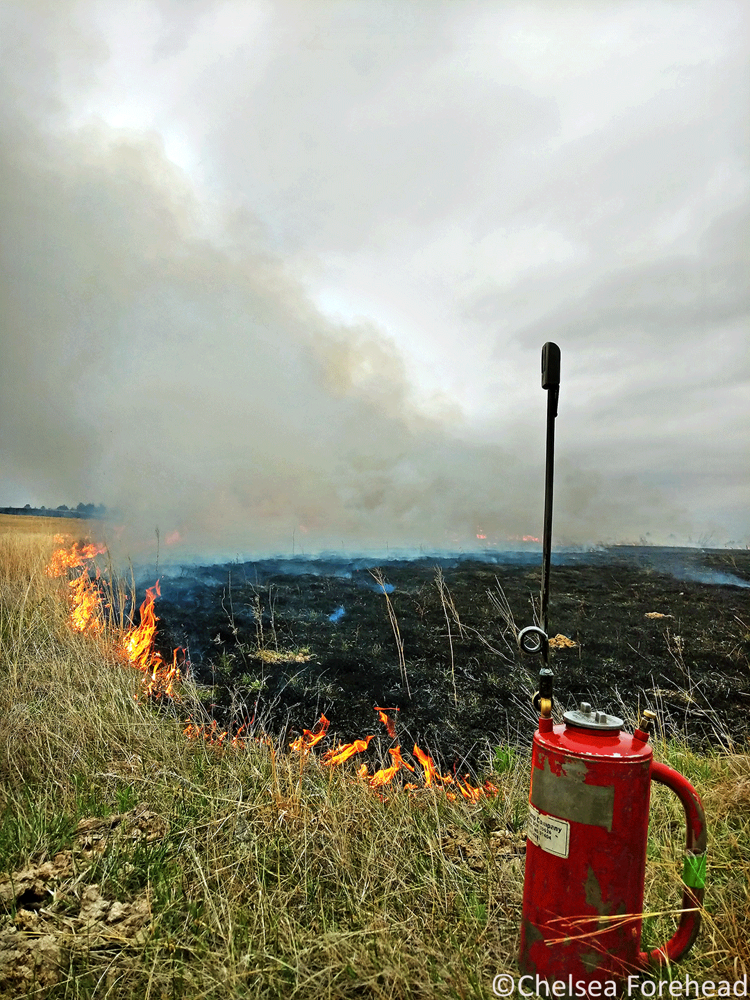 Sore legs and blistered feet brought the satisfaction of another mission completed. The dust from over 400 miles of travel and the smell of burnt grass and cedar that had settled on our protective gear was lifted into the air as I hung each set – helmet, radio harness, fire shelter pack – back on its hooks in the shed. The scent of prescribed fire – a mix of sweat, ash and fuel – brought back the excitement I felt during our most recent burn. Despite the still-lingering exhaustion from working hard in hot smoke I ached for another chance to help fill the prairie’s next prescription. I smiled and sighed as I put the drip torches back where they would await their next call to action, standing at attention all the while. The red canisters of fuel once seemed heavy and intimidating, even dangerous. After seven burns I felt an admiration for them, the kind one feels for the tool most trusted to assist with hard work.