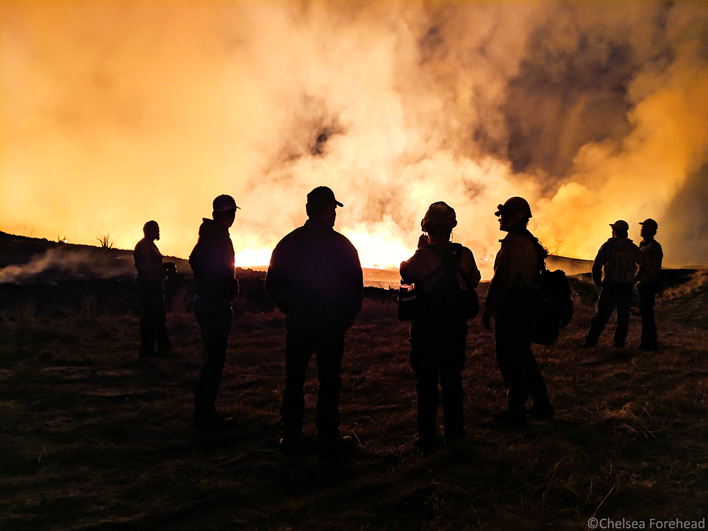 Night had fallen by the time Mary and I brought our lines of fire to meet those of Nelson and Olivia. By completing the ignition of the perimeter from both sides we were able to shift our efforts to monitoring the fire’s behavior as flames closed in around the hilly pasture. Keeping an eye on the parcel was hard to avoid. Its peaks and valleys were striped with glowing flames and dotted with torching cedars. While there had been stressful moments during the four-hour execution of the burn, the apprehension of the ranchers had evolved into enthusiasm for prescribed burning. It was clear that they felt right at home with work that was difficult, demanding, and a bit dangerous. As we discussed our experiences that night, the energy was one of a team who had just won the big game. Exhausted but exhilarated, we chatted for a while, smiling through our soot-smudged faces.