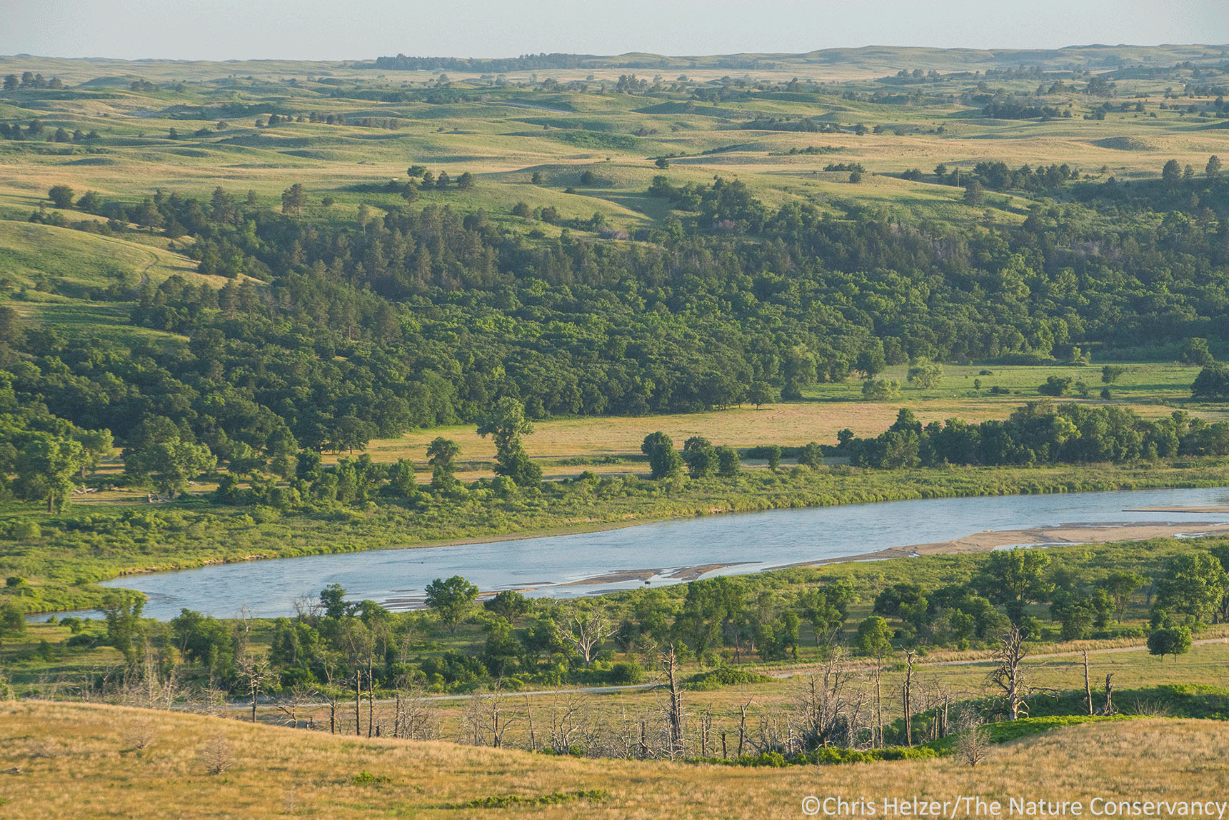 The Niobrara Valley, photographed by drone, just east of The Nature Conservancy’s headquarters. Backlit ridges with tree skeletons from the 2012 wildfire. This area north of the river is recovering, but we are still discussing how to best guide that recovery to avoid re-invasion by eastern red cedar.Matthew Ward at “The Chute”, a local landmark waterfall just upstream of the Norden Bridge .A Rorschach ponderosa pine bark test. What do you see?A portion of our east bison pasture (10,000 acres), as viewed from across the river.Chad Bladow points out a potential route for a fire break as we discuss a future prescribed fire on the north side of the river. Chelsea is taking photos and Matthew is just below, enjoying the scenery.Fungus grows on a log in the middle of a spring-fed creek along the south side (north-facing slope) of the Niobrara River. We started where the creek emerged from the ground and followed it quite a way downstream, enjoying the cool moist air along the way.Mary (left) and Chelsea (right), photographing slightly different views of the Niobrara River.Looking southeast from the ridge north of the river.