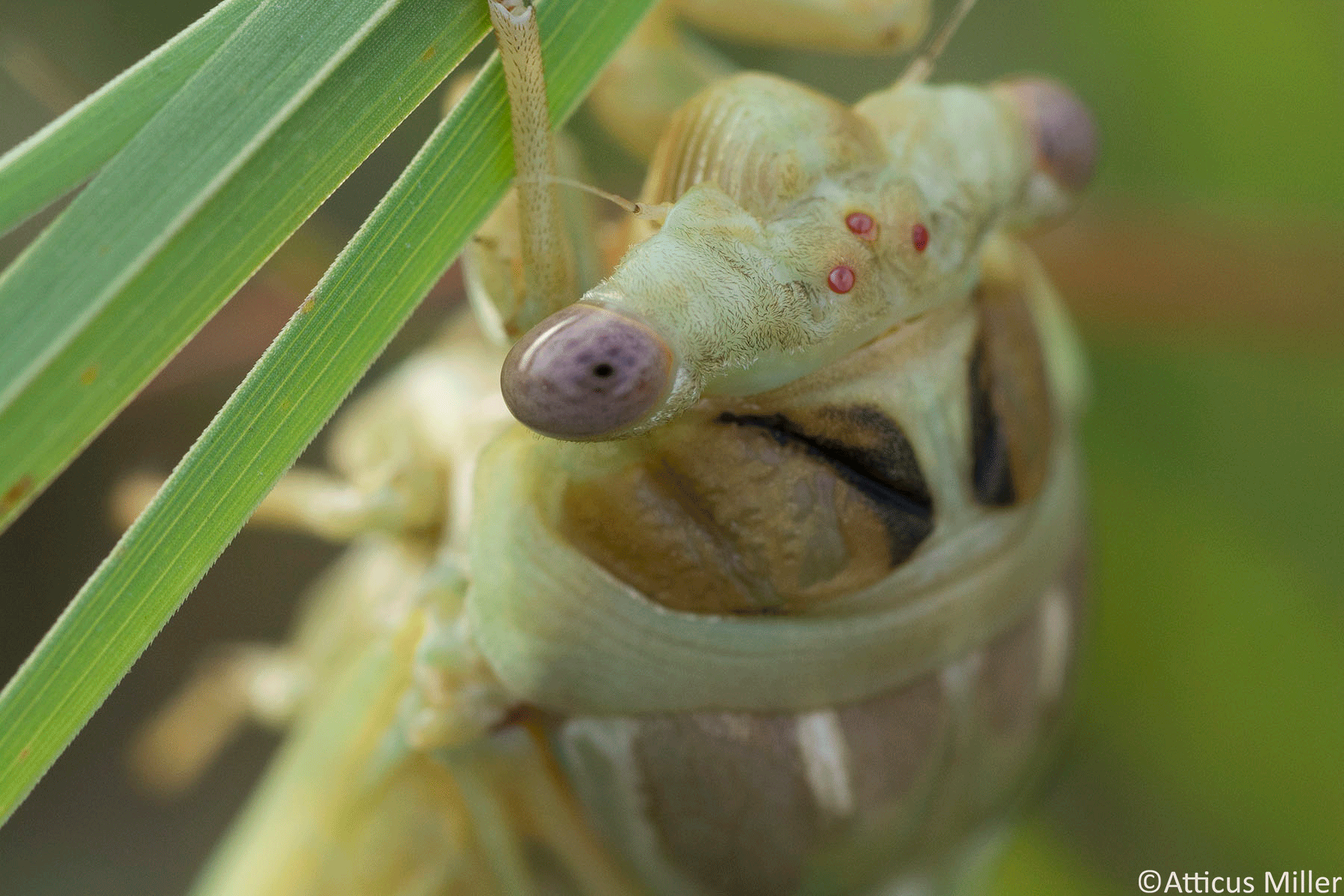 As we were walking around some hills north of the river last night, we came upon a big cicada (I think it’s a bush cicada – Megatibicen dorsatus) that was just pulling the last of itself out of its larval exoskeleton. Fascinated, we stopped to examine it and I got my camera out, even though the light was pretty flat (thick clouds).