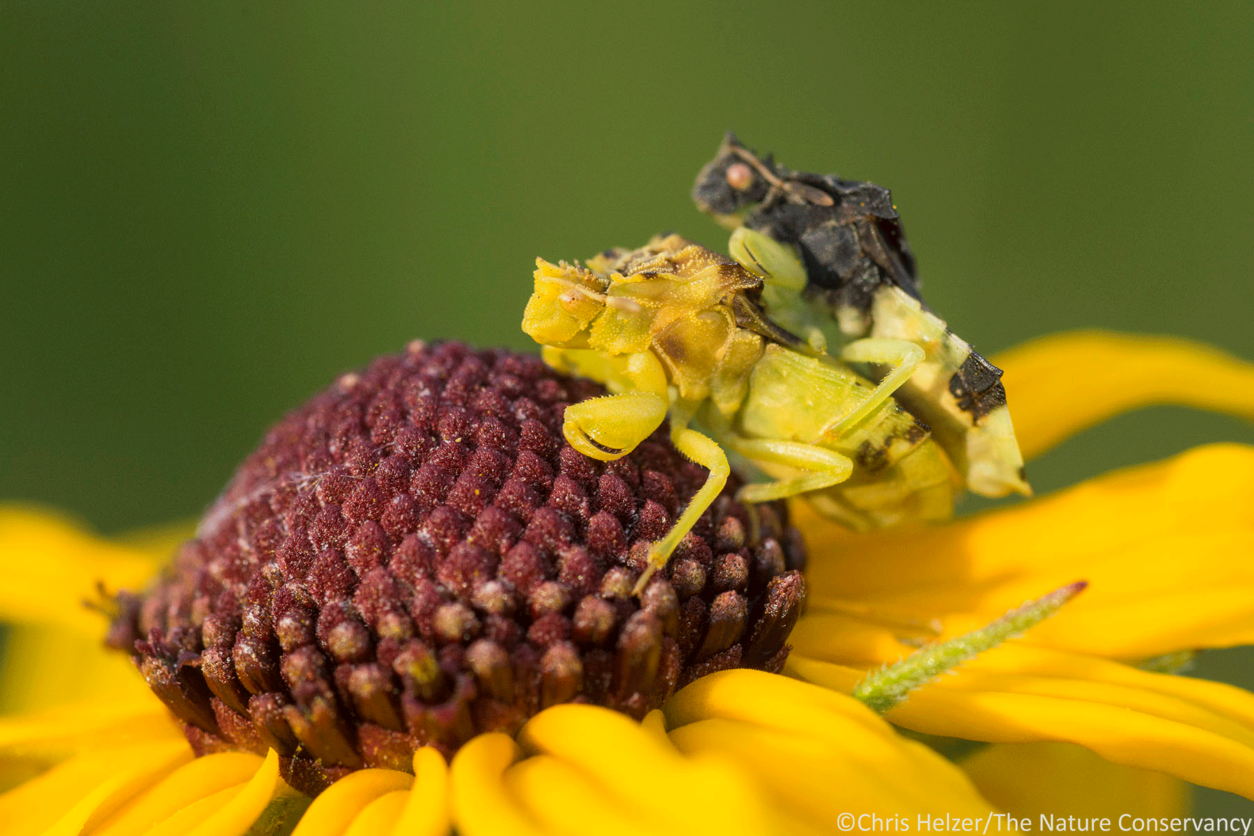 Ambush bugs (Phymata sp) mating and feeding on a bumblebee. If you look closely, you can see the same three insects (plus another bumblebee) in the photo above this. If you’re having a hard time deciphering what you’re seeing here, the bumblebee is dead and is impaled upon the proboscis of the paler-colored ambush bug (female), which is underneath the darker colored ambush bug (male).