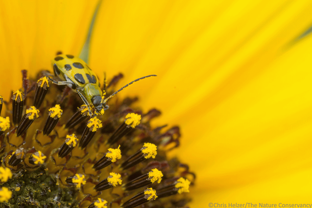 Spotted cucumber beetle adults are strongly attracted to the pollen of many plants, including this sunflower.