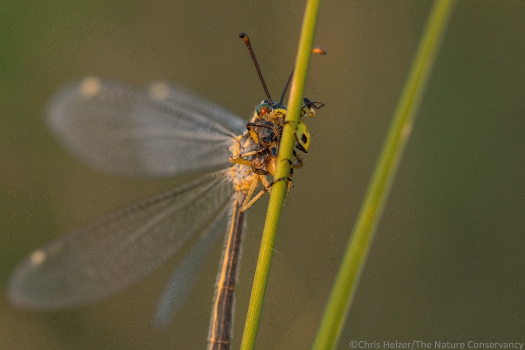 This antlion adult was feeding on this cucumber beetle when I first spotted it, just as the sun was nearing the horizon.