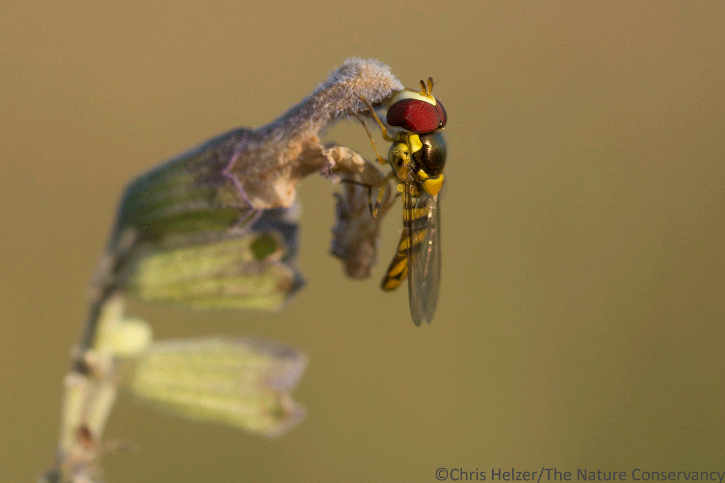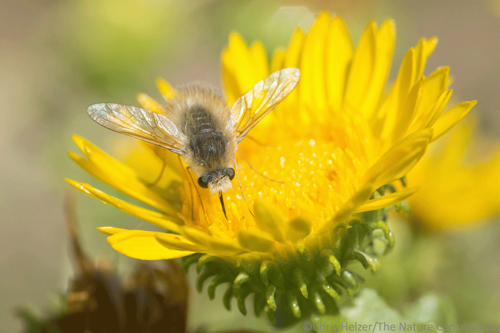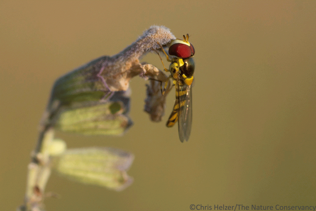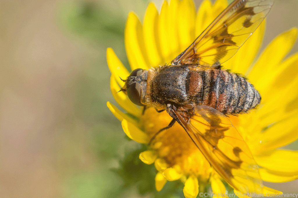 Hover flies are very common pollinator insects. Some, like this one, can have a fuzzy and stocky appearance, much like some bees. The huge eyes and tiny antennae, however, help set them apart.