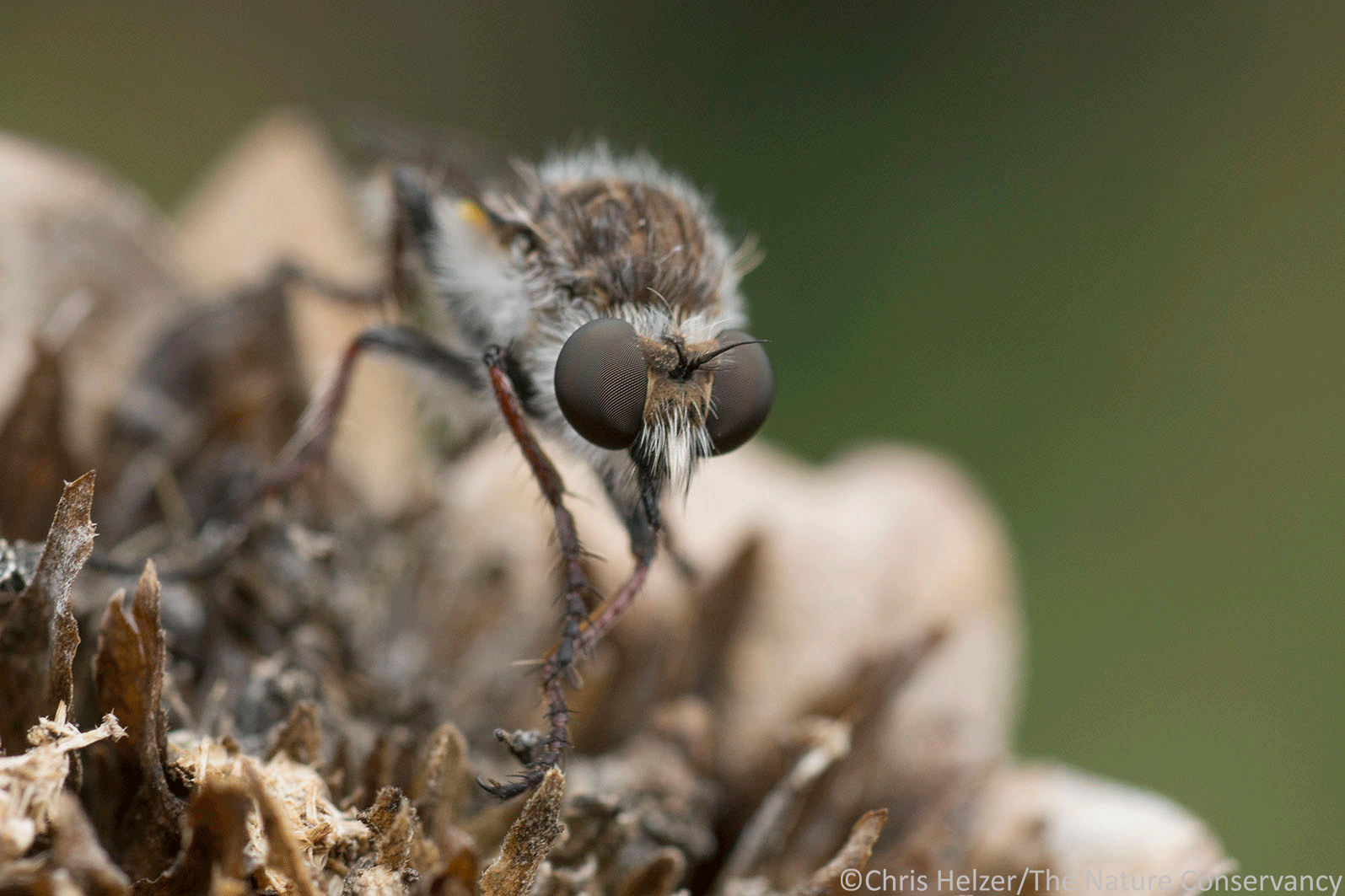 This face-t0-face view of a robber fly doesn’t do justice to its long streamlined body. Its long black mouthpart, with which it stabs prey, can barely be seen beneath the hair on its face.