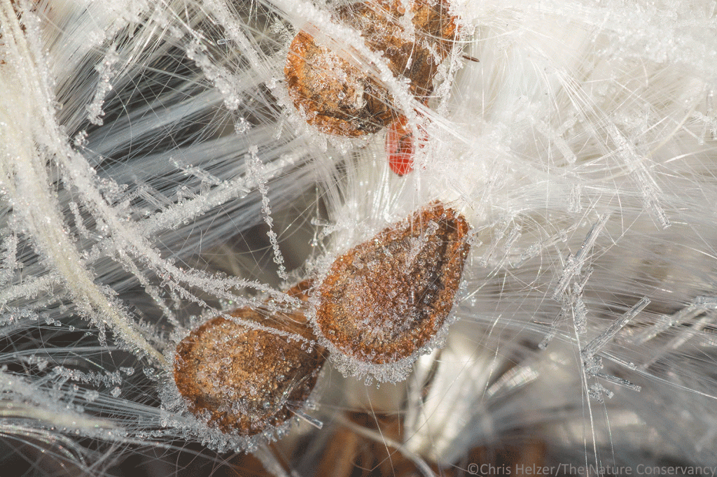 To be fair, recent freezes have eliminated most flowers and insects from the prairies around here, so photo subjects are a lot more limited than they were a few weeks ago. What am I supposed to do? Stop walking through prairies with my camera? Ha ha! No, of course not. I’m still out there looking for beauty and diversity. And I’m easily distracted by the airy filamentous pappus of a milkweed seed gently waving in the breeze.