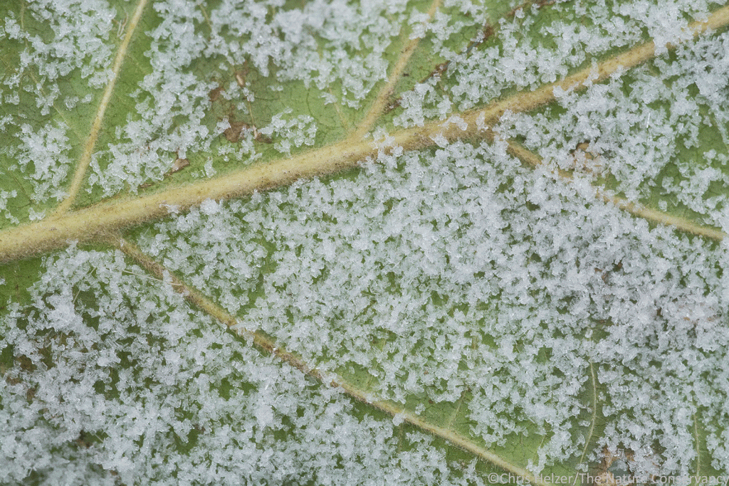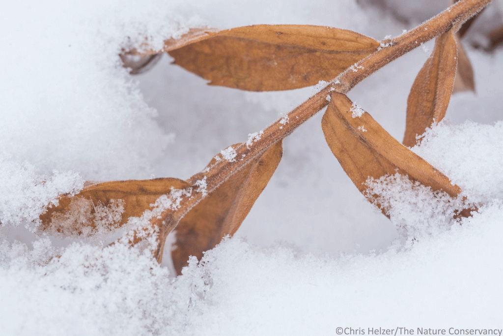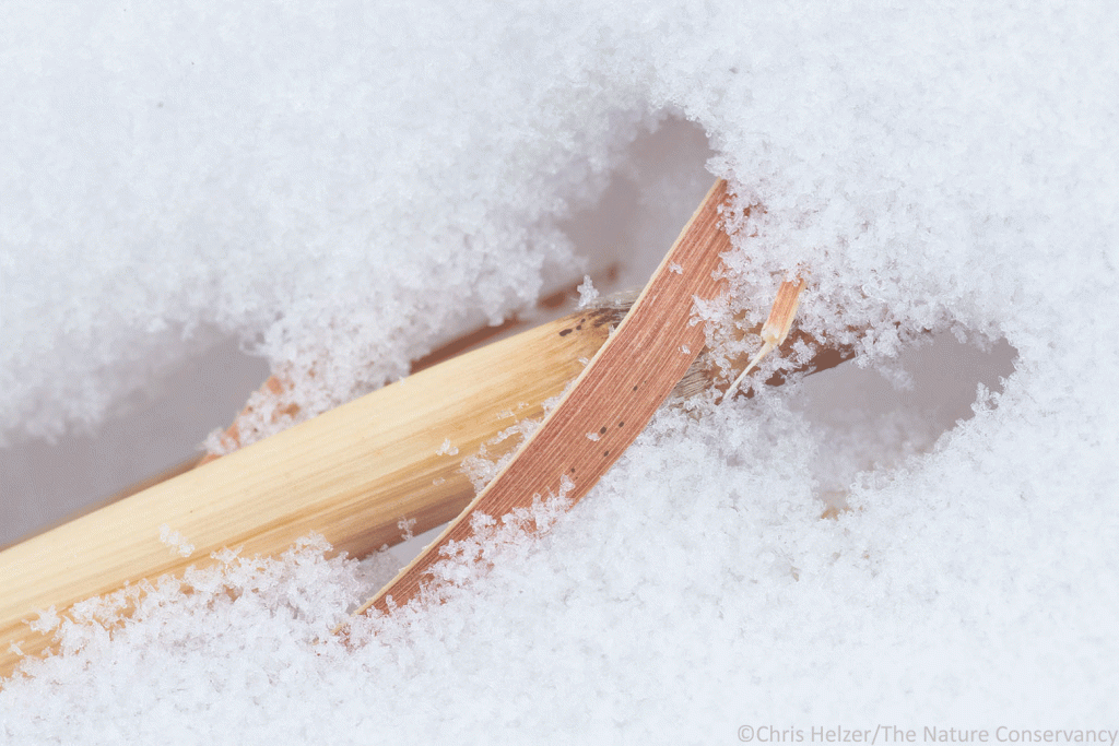 I spent a lot of time on my knees, exploring small holes in the snow where grasses and other plants were poking out. Yesterday warmed up enough to do a little melting of snow around the edges of those holes, leaving behind interesting patterns. In some cases, the ice crystals on those edges were the subject of the photo – other times, they just helped frame leaves or stems in nice ways.