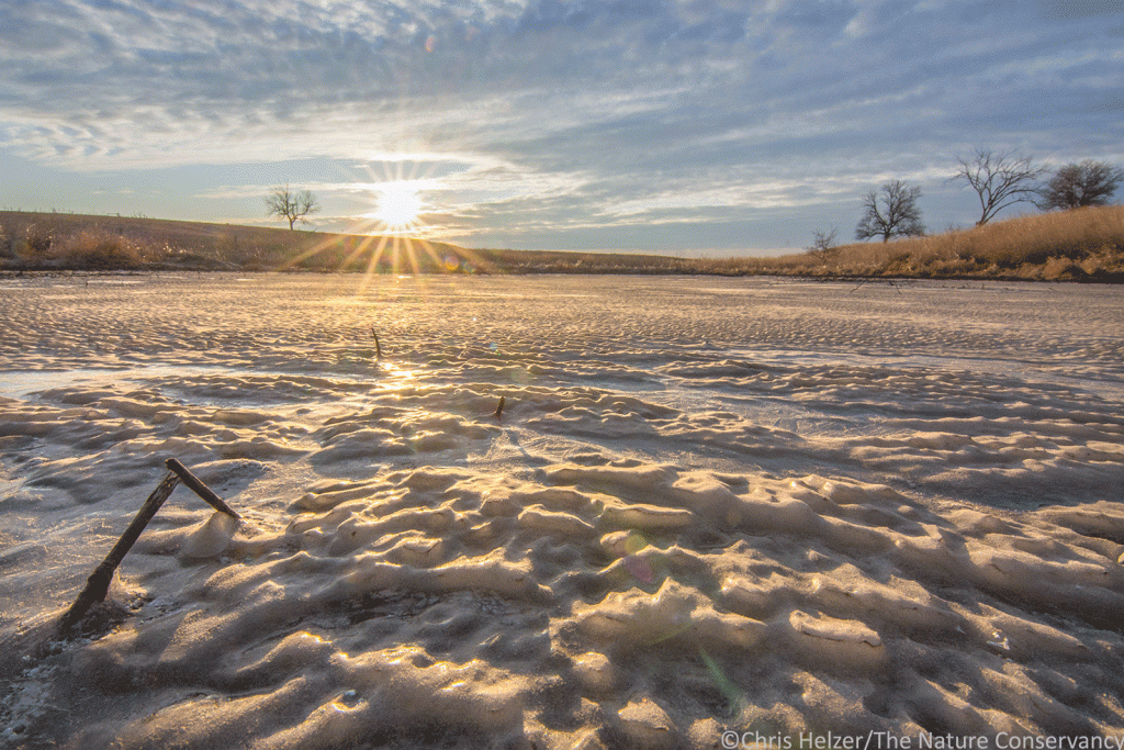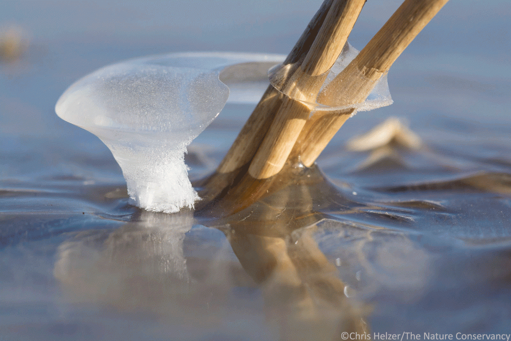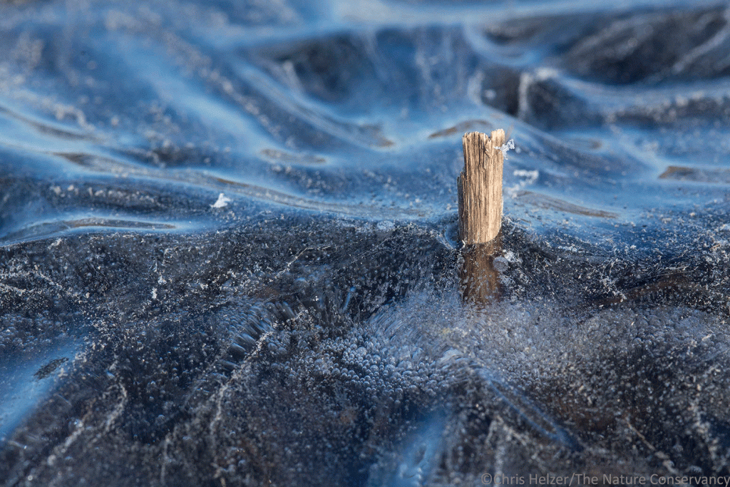 Recent temperature swings, including many freezes and thaws, have created some interesting patterns on the frozen surfaces of wetlands and ponds. Early this week, I took advantage of the latest cold temperatures to wander out on the pond/wetland at our family prairie. There was only minor cracking beneath my feet as I carefully stepped and slid across the (mostly) frozen surface. I stayed near the edges where I knew the water below me was only a foot or so deep and tried to distribute my weight as evenly as I could. That’s all completely normal behavior, right?