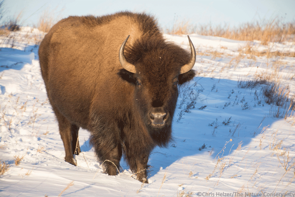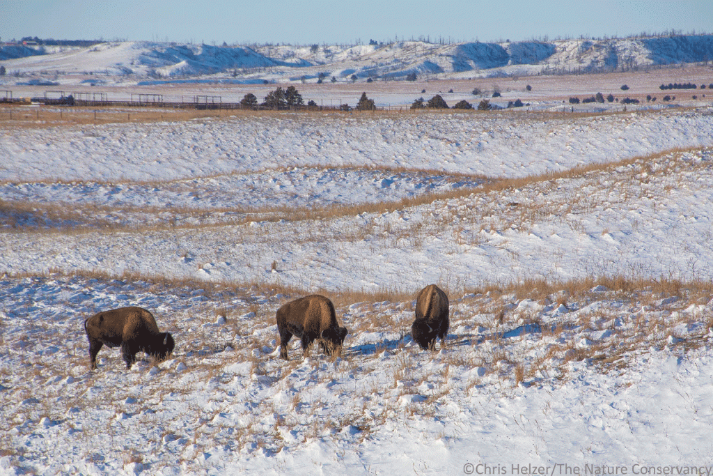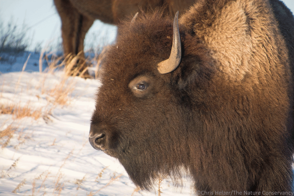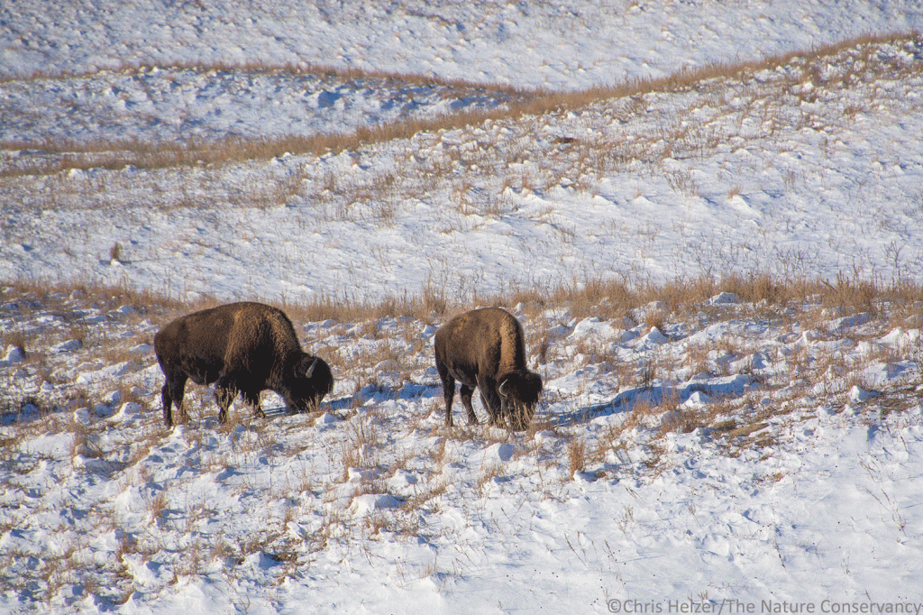 Kim and I didn’t make it up to the Niobrara Valley Preserve last week, as originally planned, but I made a quick trip this week. The area received around 7 inches of snow, which blew up into big drifts on the leeward side of the hills (and road banks). I waited until the roads cleared enough to travel safely and then drove up in time to catch the late Tuesday afternoon light. I hopped on my ATV and headed out into the snow, hoping to find scattered bunches of bison.