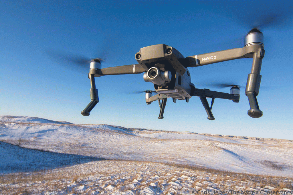 I had the drone approach very slowly, watching from a distant hilltop to gauge the reaction of the bison. They were definitely aware of the drone’s presence, but didn’t seem particularly worried about it. Some of them lifted their heads to find and track the drone’s progress, but others kept their heads down and grazed on. I gradually moved the drone lower and closer, constantly watching for any kind of nervousness or shying away by the bison. Eventually, I stopped and had the drone hover, maybe 30 feet or so from the herd. (I’m guessing on that distance because I was several hundred yards away at the time.) I zoomed in with the lens and was satisfied with the results.