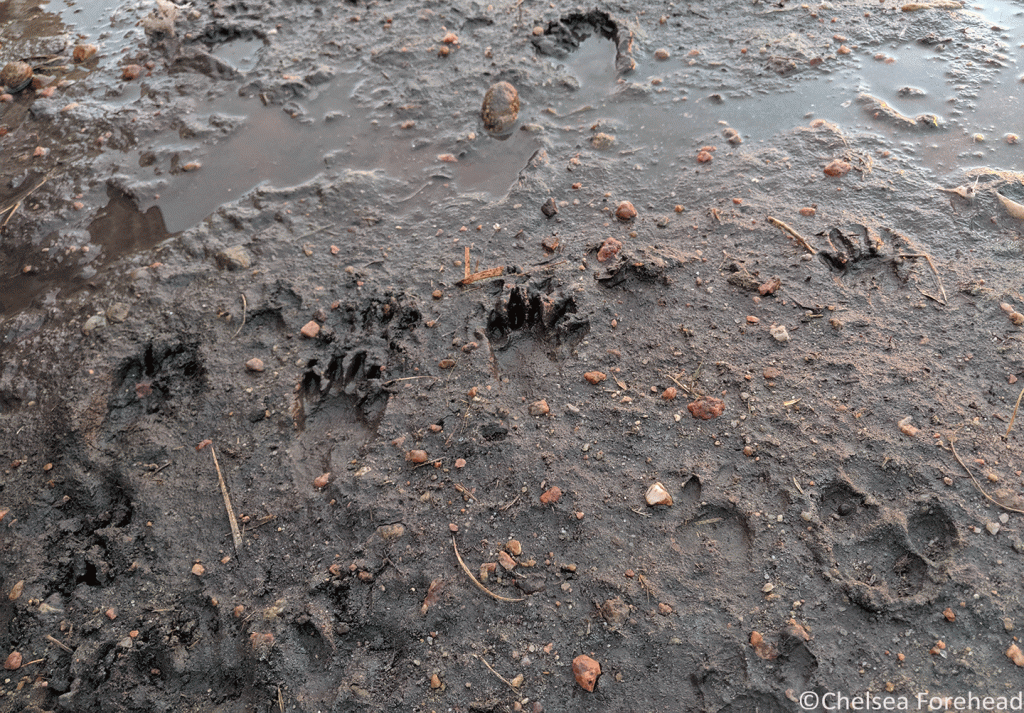 A mixture of raccoon tracks (center) and coyote tracks (bottom right) around the tank. Photo by Chelsea Forehead.