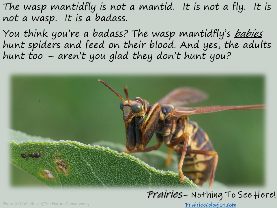 7. Thanks! I shared the mantidfly meme on the Facebook and it’s traveling well. I’ve only been able to photograph one once, on my back porch where it was likely hunting spiders or laying eggs maybe. I was excited to finally see one and get photos, even if it was the less wasp-colored version. I’ll share more memes in the coming weeks, maybe get some more subscribers to the blog!