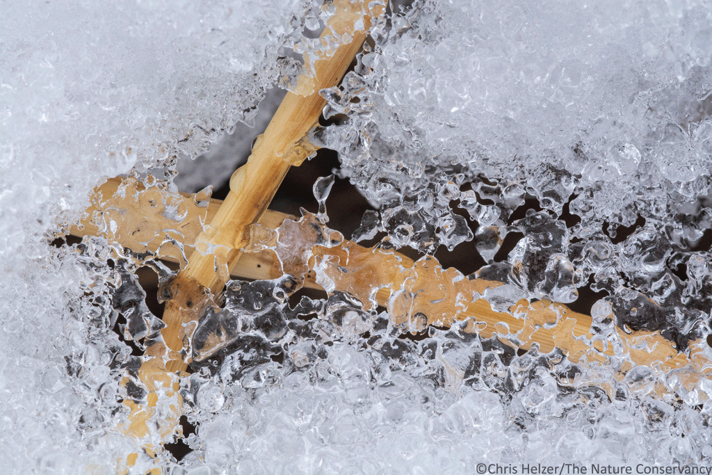 Last weekend brought several inches of snow. Despite the overcast skies, I felt the need to get out and do some photography before the melting snow disappeared altogether. Sunday afternoon, I looked out the window and convinced myself that the sky had brightened slightly, and decided that was a good enough reason to go. I slipped across town with my camera and spent an hour or so by myself at Lincoln Creek Prairie, getting my knees wet and appreciating the shapes of melting snow crystals.