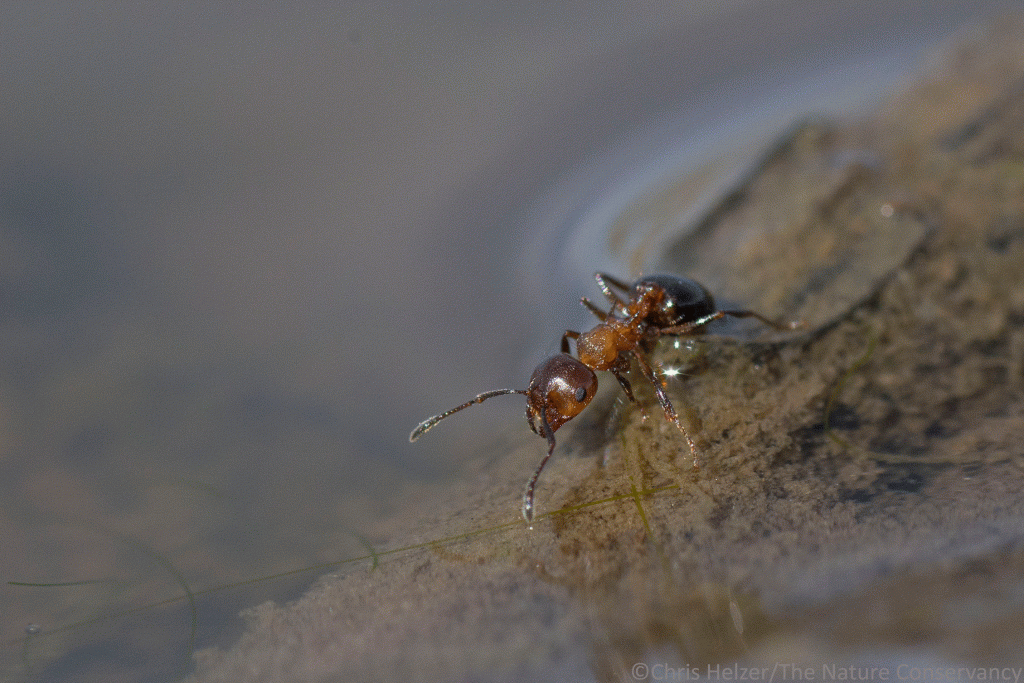 An ant found itself marooned on a small mud island, surrounded by water. That made it easier to photograph, but I felt bad about its isolation.
